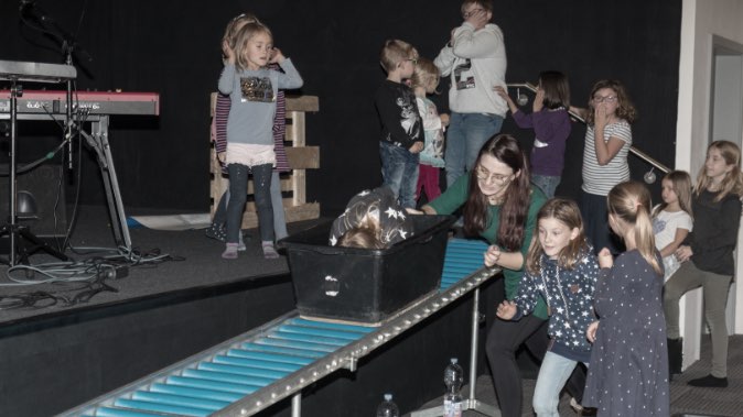 Gemeinsam treffen wir uns anschließend im Plenum und erfahren etwas von Gott. Meist gibt es ein kurzes Theaterstück und es wird gemeinsam gesungen.